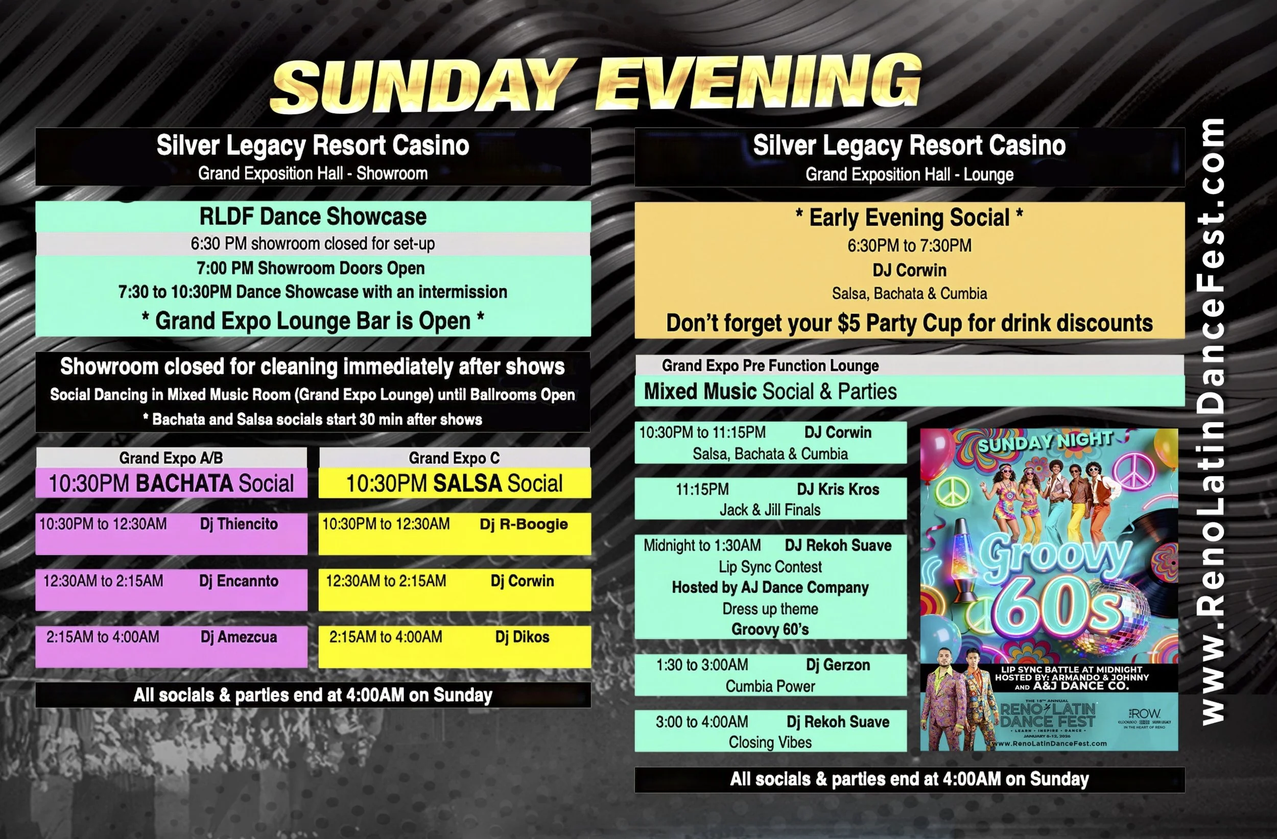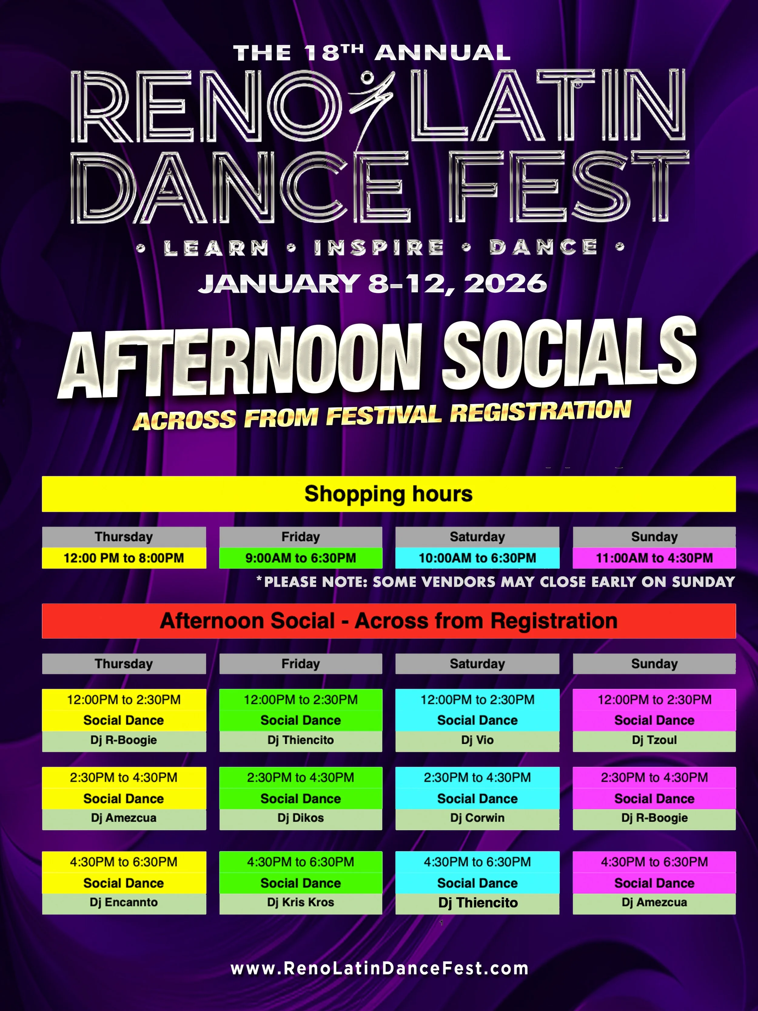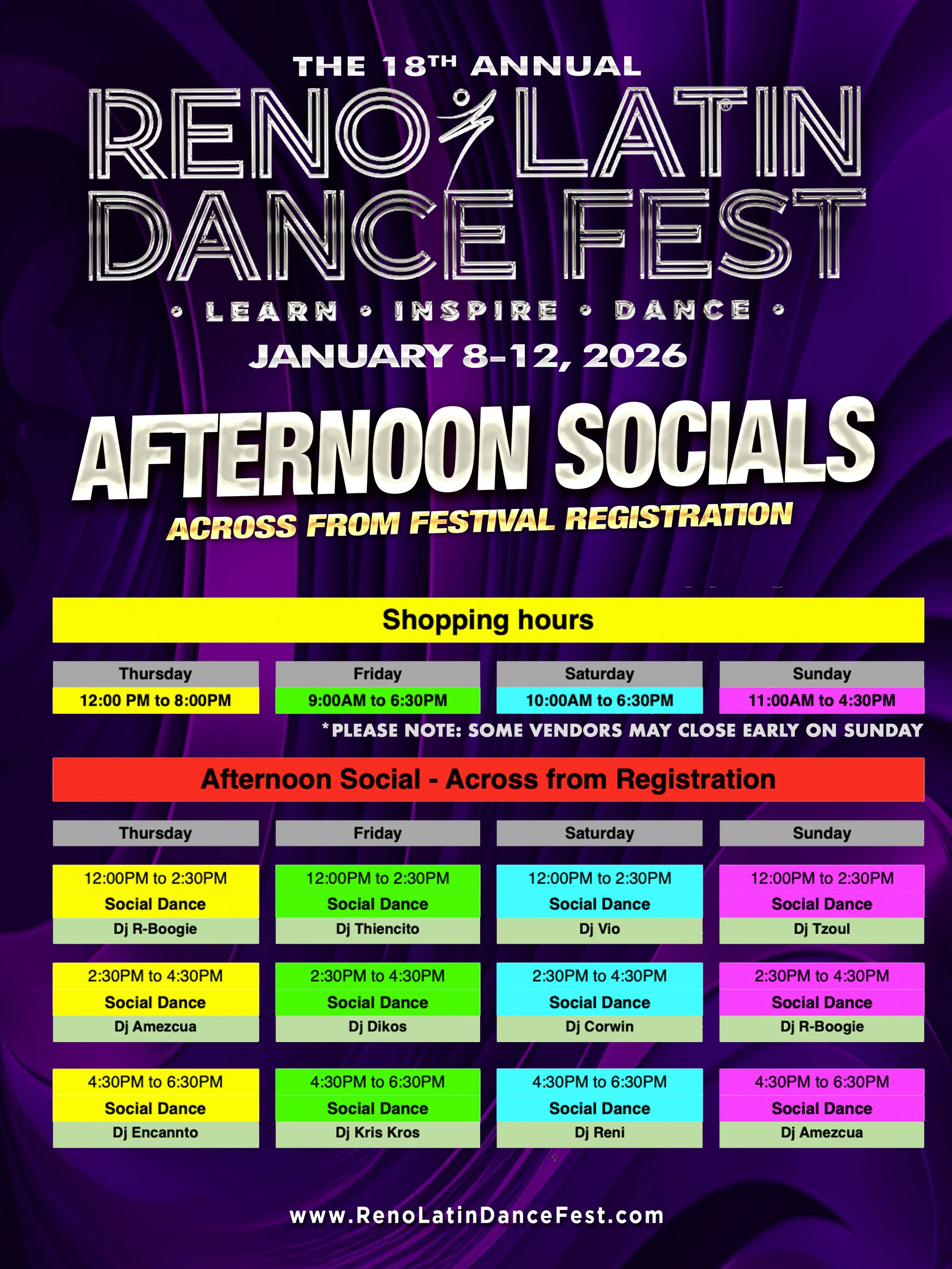 Includes the Afternoon Socials plus all shows and evening social dancing/parties.