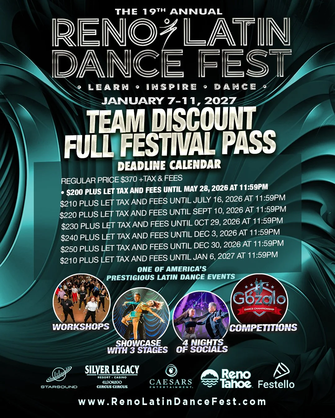 The 2027 Reno Latin Dance Fest starts Thursday, 1/7/2027 at 12:00PM. Ends Monday, 1/11/2027 at 4:00AM.